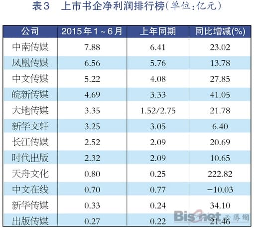 从表3可以看出,因移动网游戏业务营业收入1.21亿元,同比增长340.81%,实现净利润6825.26 万元,同比增长349.19%,天舟文化报告期内实现归属上市公司股东净利润8011.86万元,同比增长222.82%,再度成为上市书企里净利润增幅 的**位。而由于增加了对教育公司、汤圆的研发和推广投入,中文在线的盈利较去年同期略有下降10.03%,实现归属于母公司净利润为696.27万元, 成为净利润榜单的另一极。令人欣慰的是,在其他10家上市书企中,除新华文轩净利润同比增长仅为6.40%外,其他均为两位数增长,按增幅高低依次为皖新 传媒、新华传媒、中文传媒、中南传媒、出版传媒、长江传媒、凤凰传媒、时代出版,分别增长41.05%、34.10%、27.85%、23.02%、 21.78%、21.46%、20.69%、13.78%、10.65%。