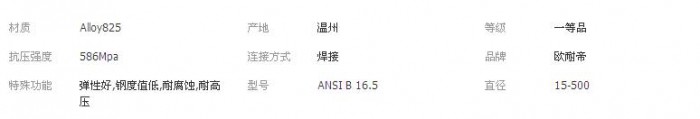 主要特性:合金825是一种镍、铁、铬、钼、铜的奥氏体合金。是一种通用的工程合金.在氧化和还原氧化性热酸环境中均有很好的耐腐蚀性能。 高镍成份使合金具有的抗应力腐蚀,广泛应用于各种使用温度不超过550度的工业领域.